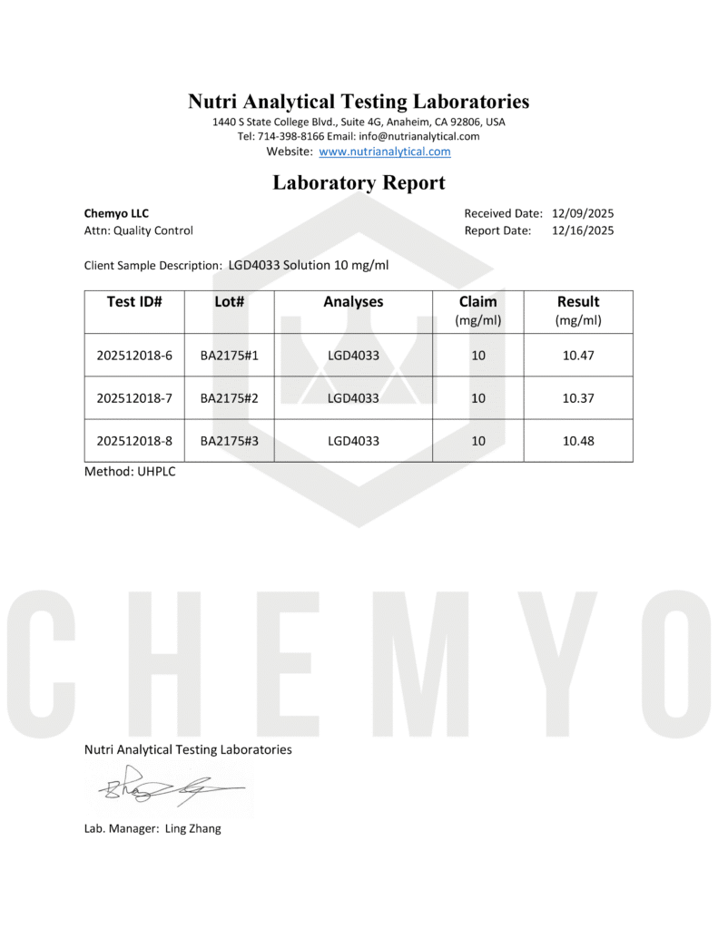 | Composition | 99% PEG400, 1% LGD-4033 (>99% purity) |