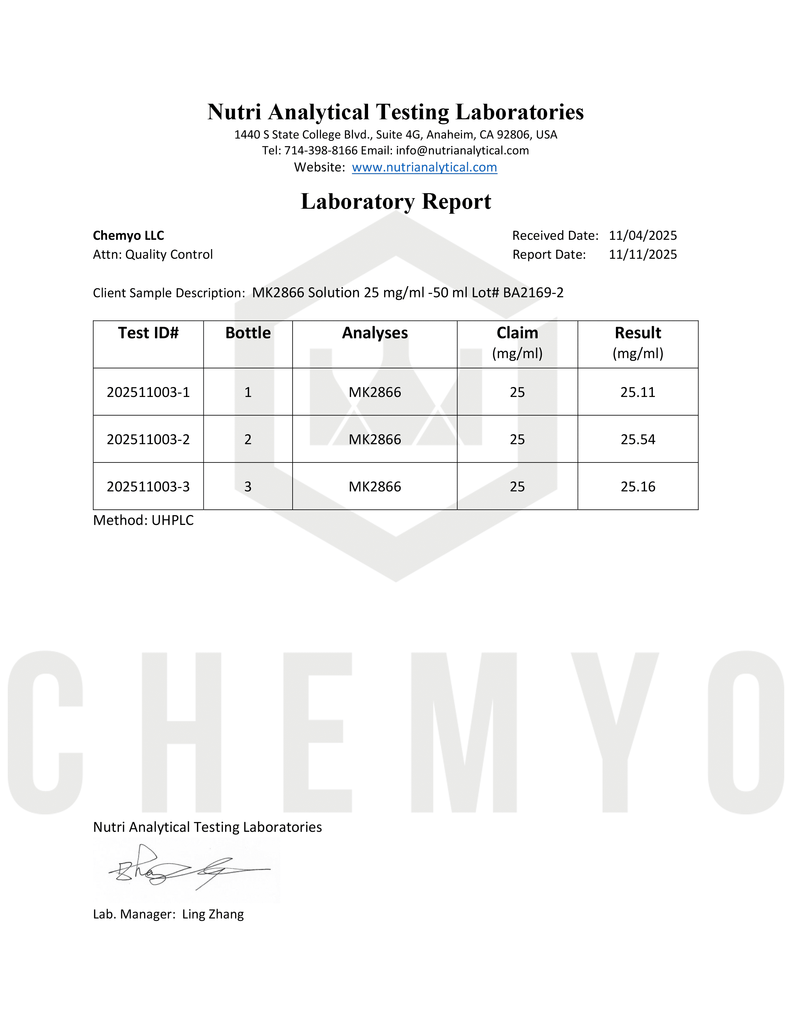 | Composition | 97.5% PEG 400, 2.5% MK-2866 (>99% purity) |