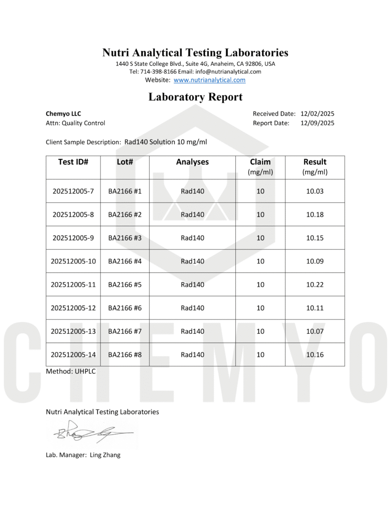 | Composition | 99% PEG400, 1% RAD140 (>99% purity) |