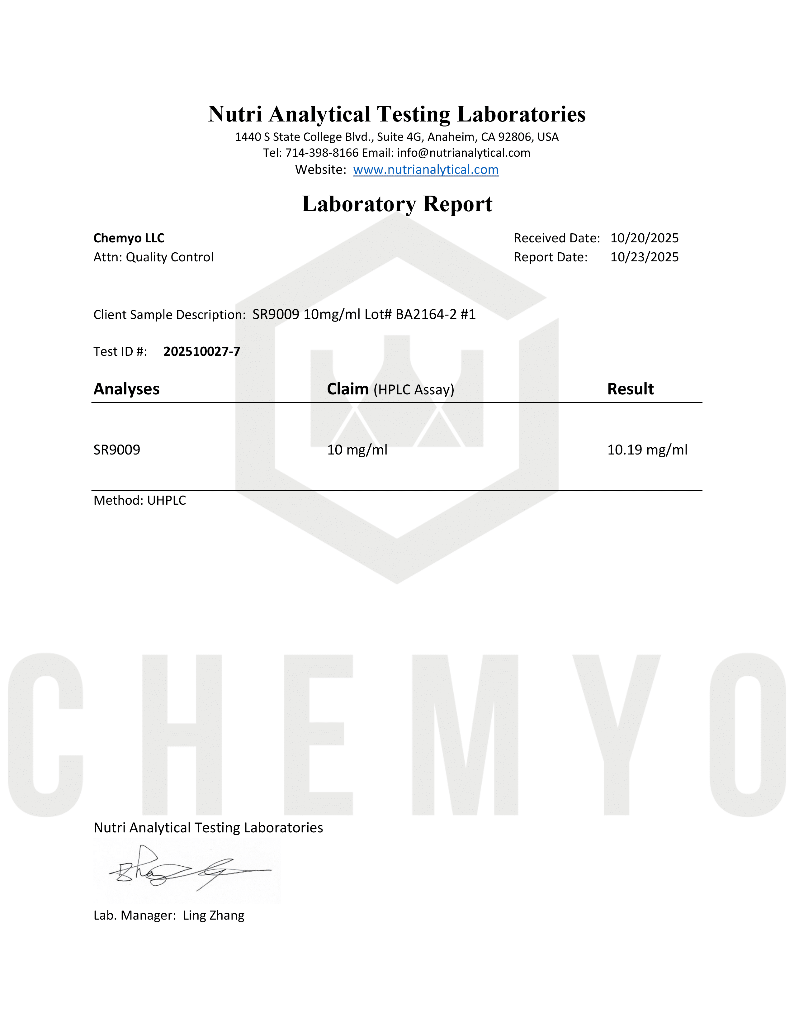 | Composition | Peg400, 1% SR9009 (>99% purity) |